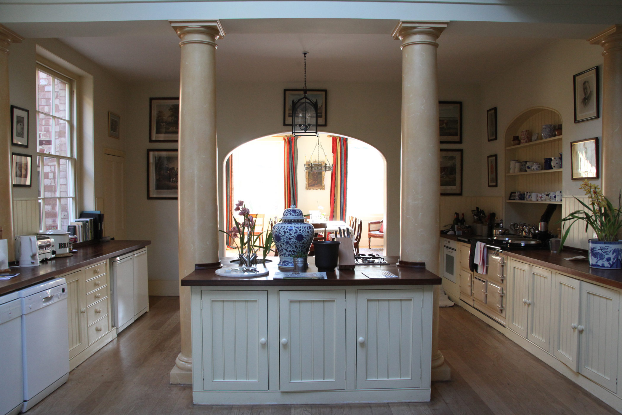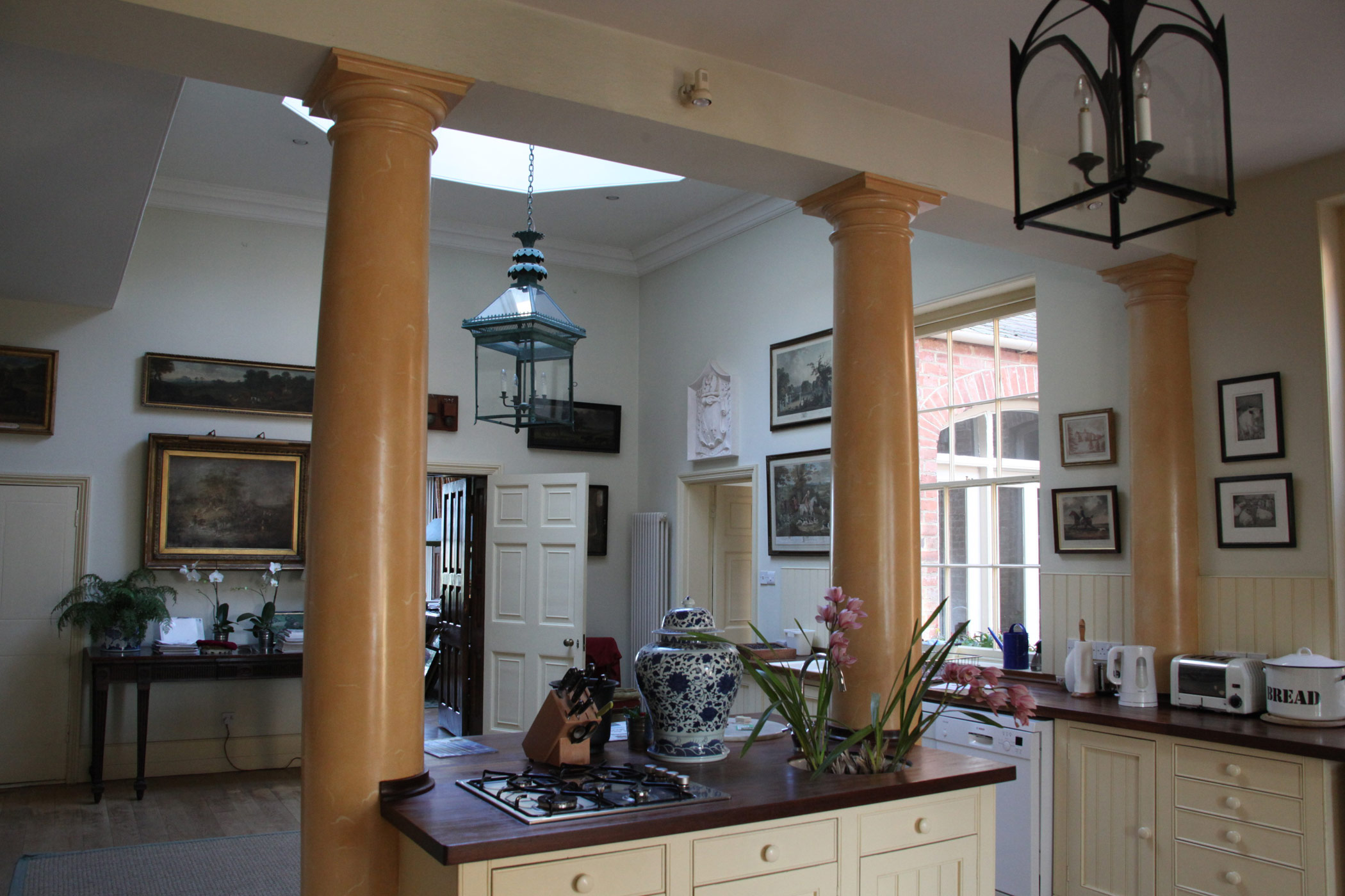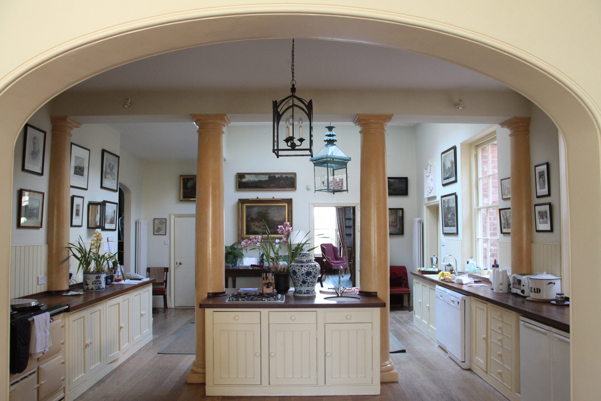 This house was completely remodelled in 1825 by George Basevi (1794-1845, a pupil of Soane). Basevi also worked on Gatcombe and Painswick House. He died when he fell through the floor of the belfry at Ely Cathedral. This house had been further extended in the late Victorian era, with bedroom accommodation over a billiard room and further pantries and stores occupying the stable yard. We demolished much of the later excrescences and formed a lightwell over the new kitchen by removing the bedroom above.