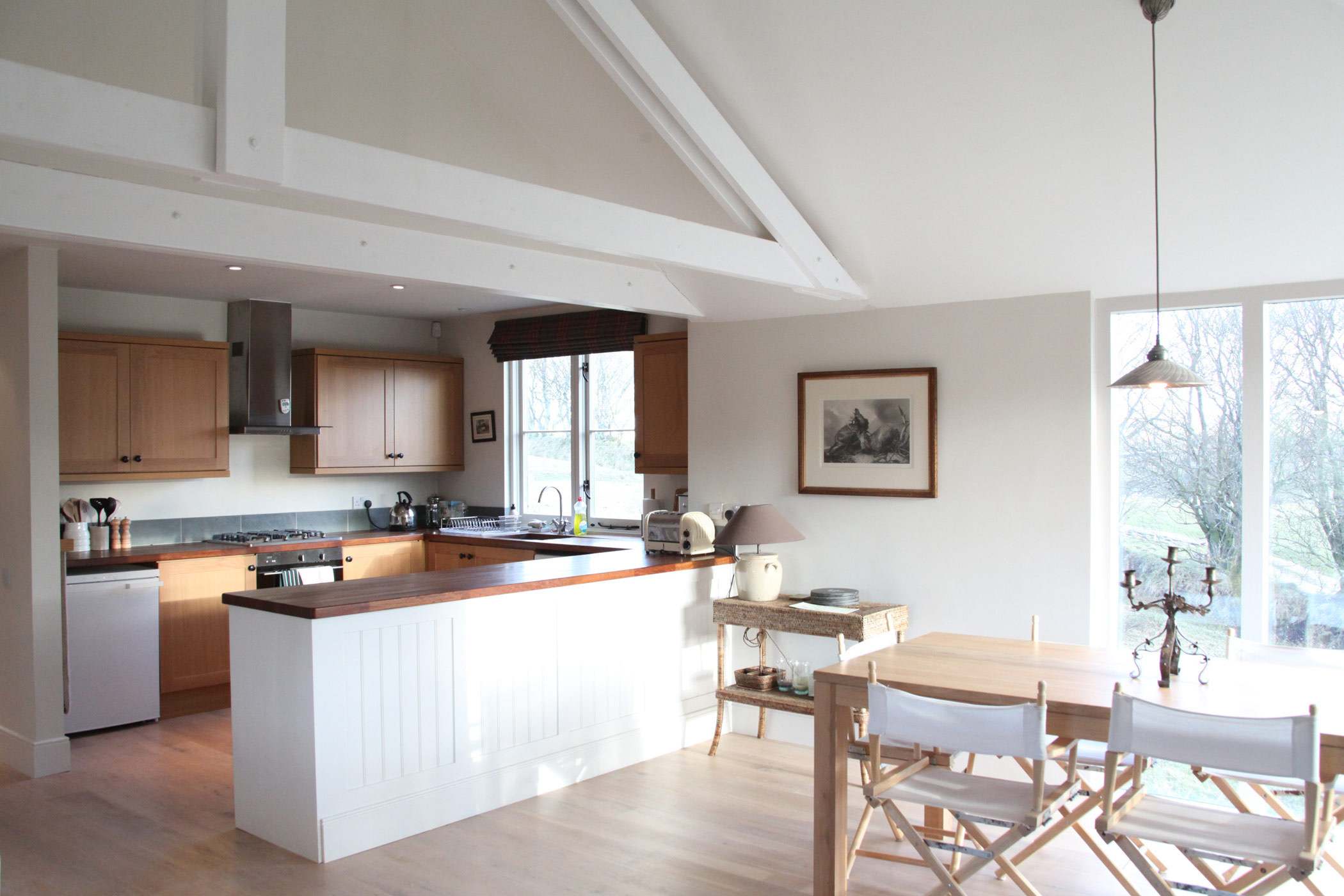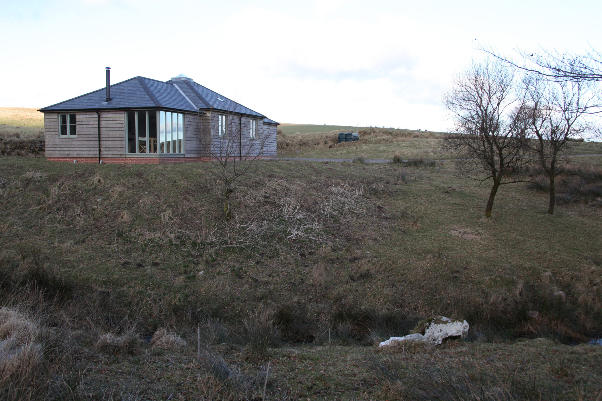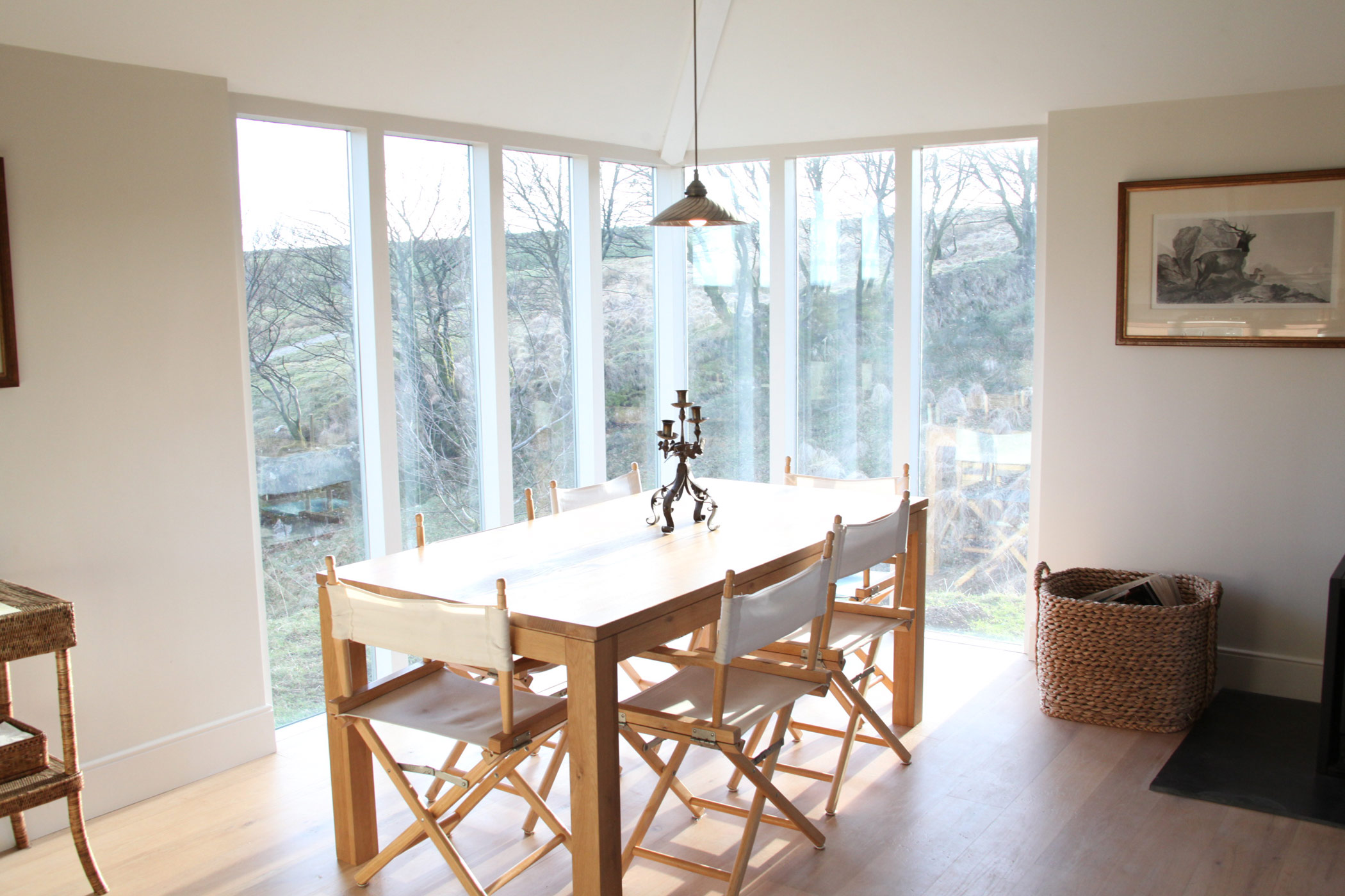 When my client bought this estate, the last thing he wanted to do was to vacate the estate manager and his family from the estate house. We were asked to convert a derelict hostel on the estate into a suitable dwelling, but we had to keep within the existing envelope. The house is characterised by a very high degree of insulation and an intentionally non-opening picture window on the windward corner. This property is situated at 1300 feet above sea level.