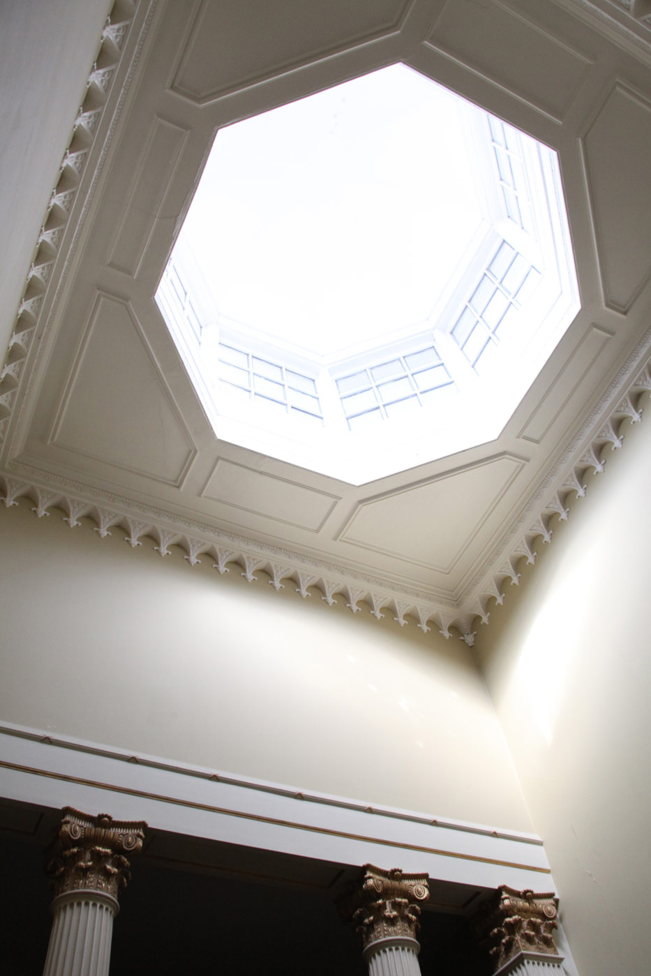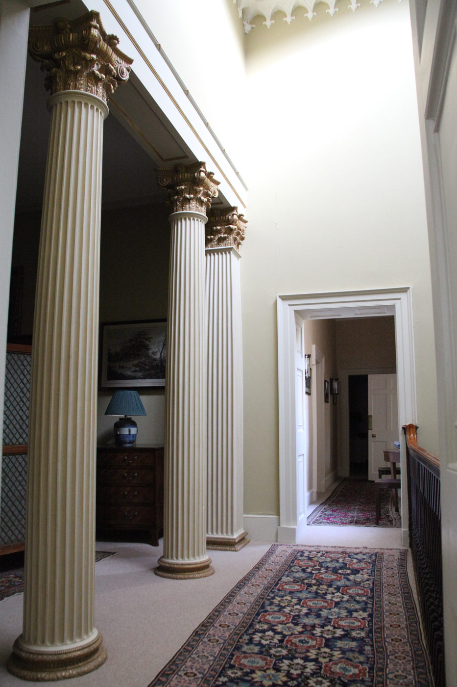 At first floor level the landing was opened up and 7/8 facsimiles of the columns in the ground floor hall were introduced. The cupola over the main stair had been expeditiously replaced with a garden greenhouse. We recreated it by extending the sawn-off mullions, and by working from a contemporary watercolour of the house.