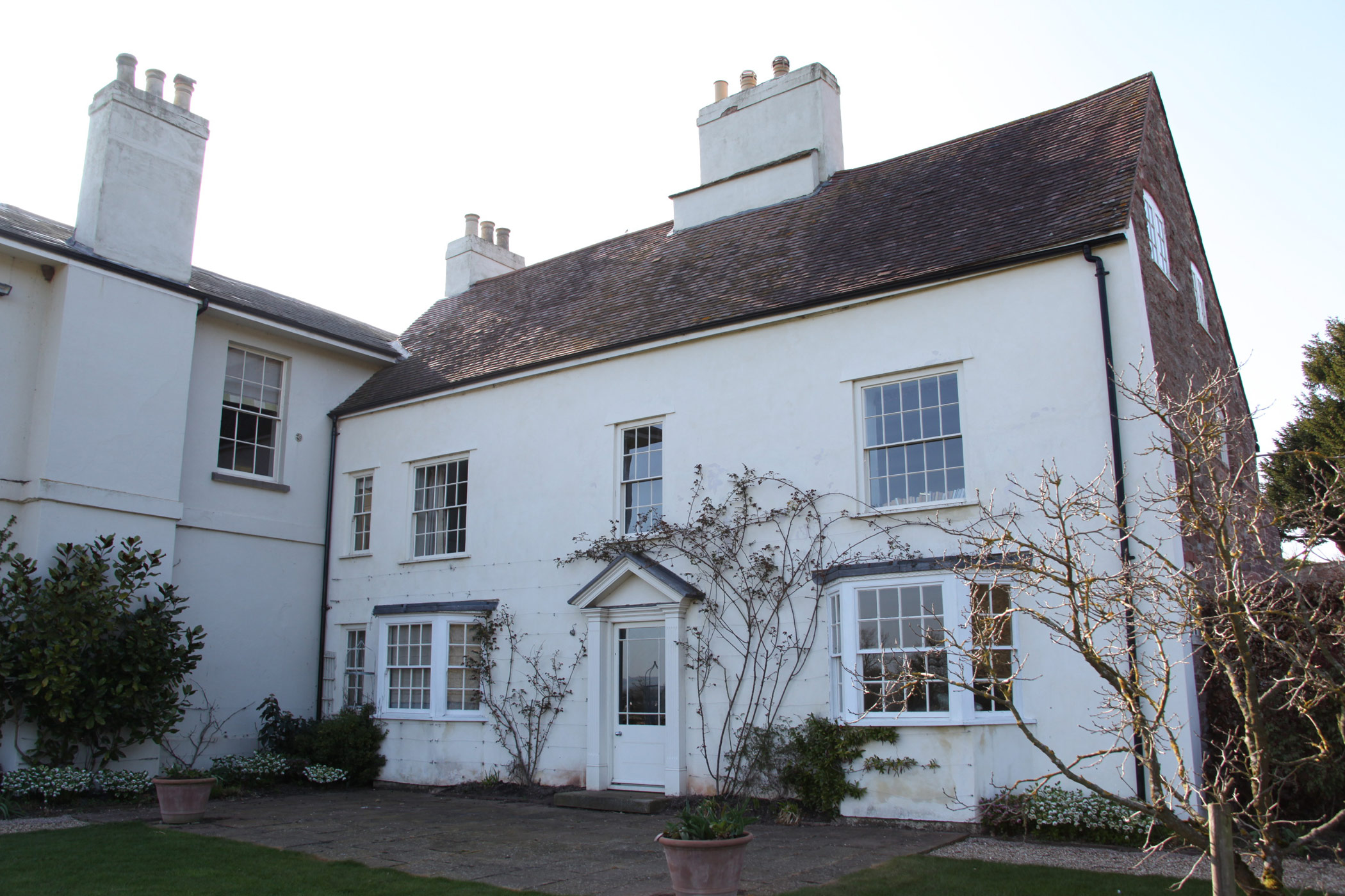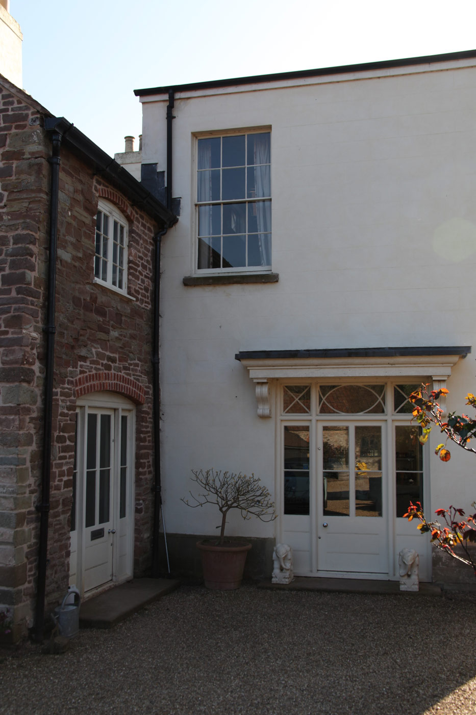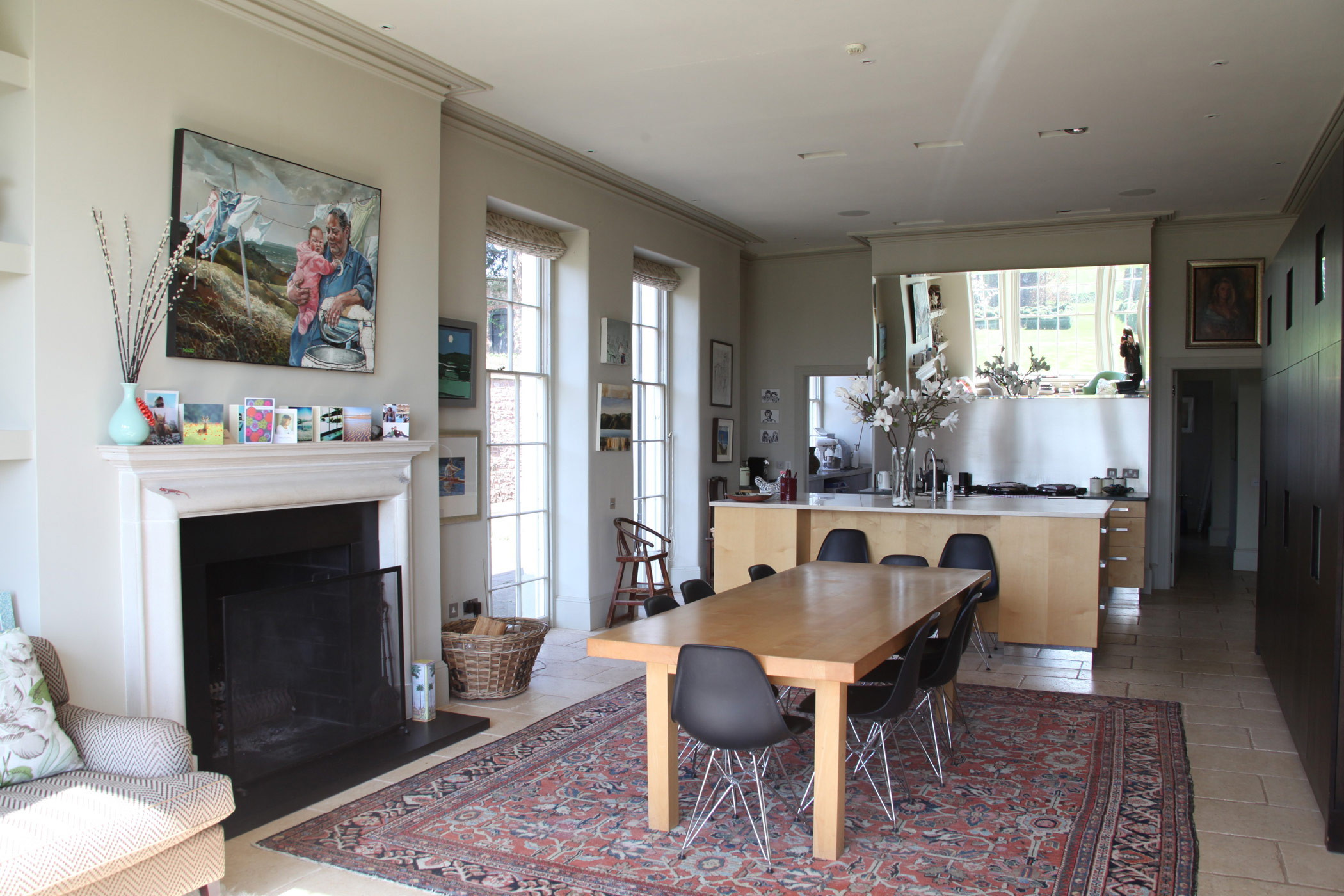 This 18th century farm house had been extended in the 1950s, but was somewhat spoilt by a granolithic concrete staircase giving direct access from the kitchen wing to basement garages under the original drawing room. The landscape designer Tom Stuart-Smith suggested raising the ground and burying the basement, and fortunately the planner agreed. A notable improvement was the introduction of sash windows to the breakfast room, which could be raised sufficiently into the wall above to give egress for the six foot six client.